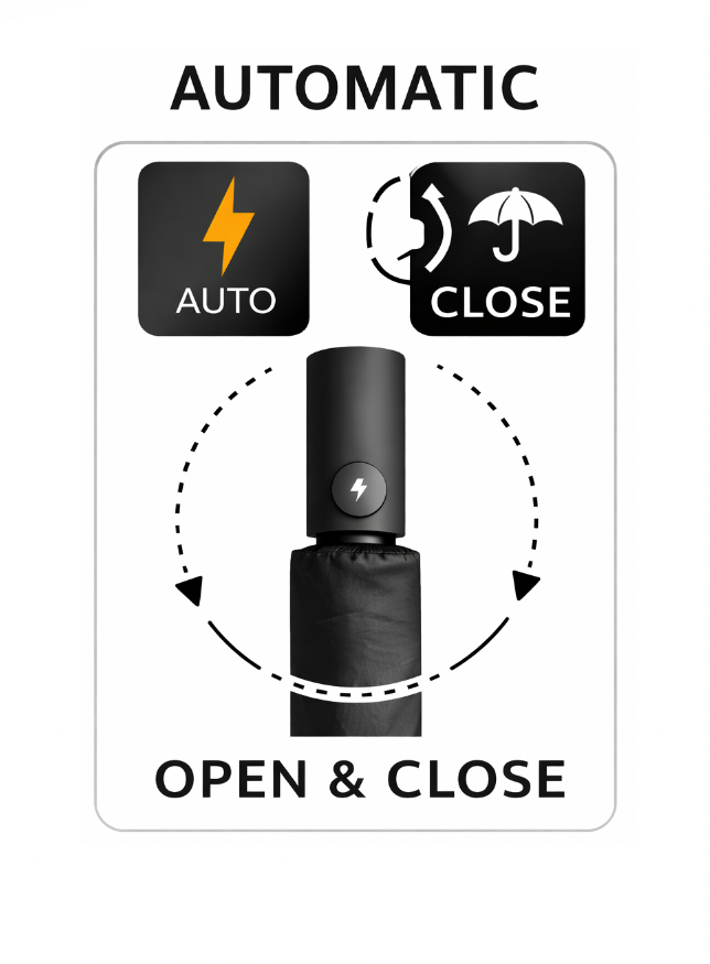 Paraplyet är utrustat med en automatisk öppna- och stängfunktion, vilket gör att du snabbt kan fälla upp eller stänga det med en knapptryckning – perfekt när du har handskar eller när vädret snabbt slår om.