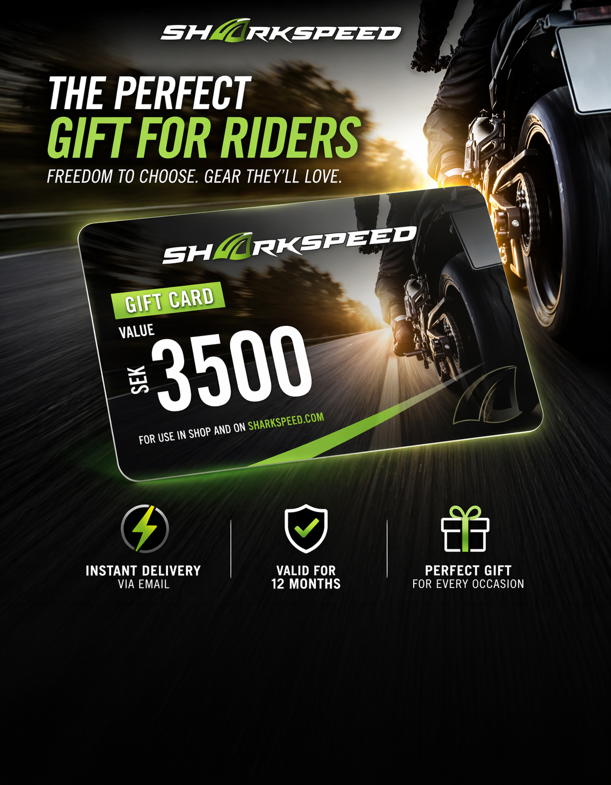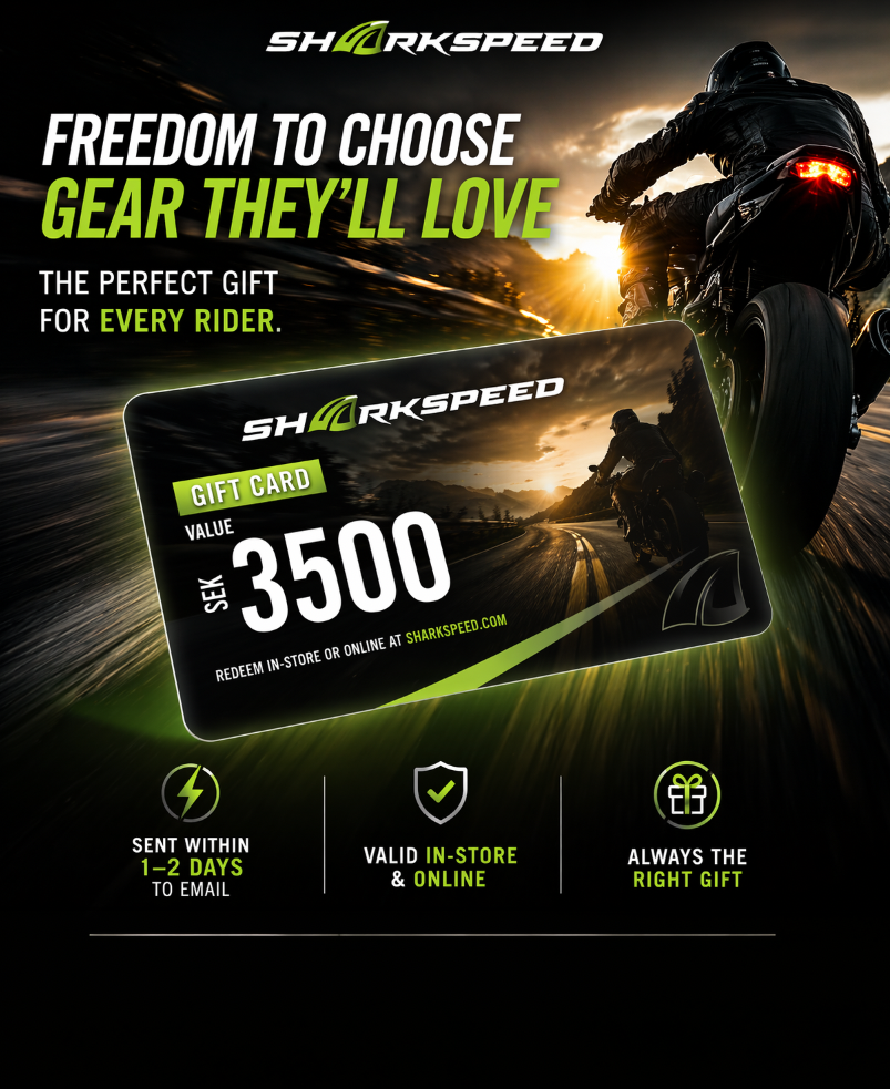 Suchst du ein Geschenk, das immer passt? Mit einer Geschenkkarte von Sharkspeed schenkst du die Freiheit, selbst aus unserem Sortiment an Motorradbekleidung, Ausrüstung und Zubehör zu wählen.