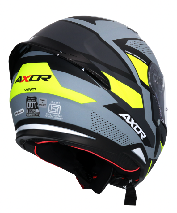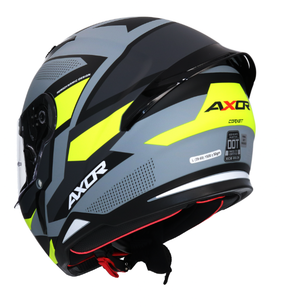 Visier: Pinlock-fähiges Visier – ausgestattet zur Befestigung von Pinlock (beschlagfreies Visier). Bietet Panoramablicke mit raffinierter Klarheit bei jedem Wetter. Das Axxis Quick Release System (QRS) hilft dabei, das Visier problemlos zu entfernen und auszutauschen. Optimaler Visierverschluss.