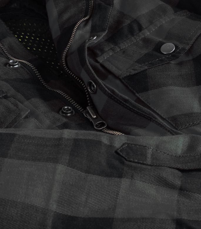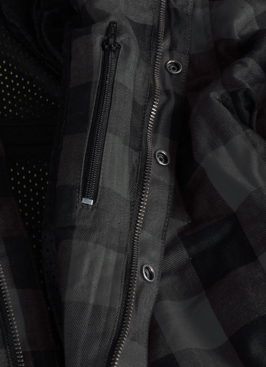 Flanell motorcykel skjorta kombinerat med hög säkerhet med CE Level-2 skydd för axlar och armbågar samt ryggplatta ingår.