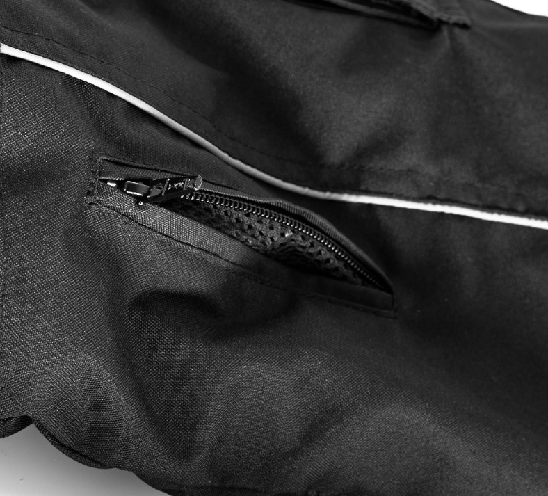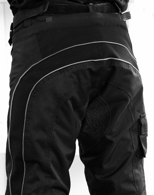 Im Rücken mit der Jacke verbindbar. Belüftung mit Reißverschluss an den Oberschenkeln.