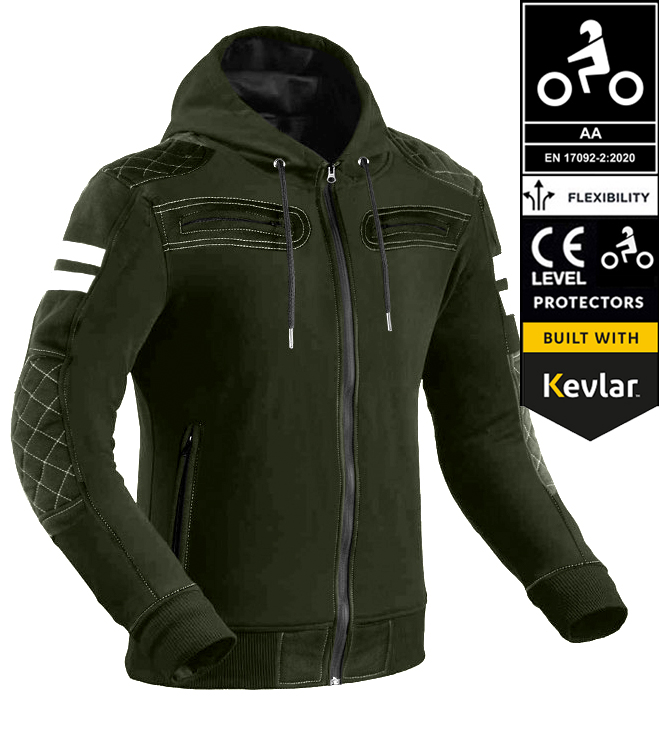 Retro Hoodie mit vollständigem Dupont Kevlar. Eine lang ersehnte Kapuzenjacke, die sowohl als Jacke als auch als normales Sweatshirt funktioniert. Die Hoodie ist für eine optimale Passform mit 2-Wege-Stretch konzipiert und bietet gleichzeitig hohe Sicherheit mit CE-Level-2-Schutz für Schultern und Ellbogen sowie Rückenplatte inklusive. Die gesamte Hoodie ist mit einem inneren, vollständig abdeckenden Membran aus DuPont™ Kevlar®-Fasern ausgestattet, die Schutz bietet. Hoodie mit hoher Sicherheit und Beweglichkeit. Die gesamte Hoodie wird behandelt, so dass das Wasser nur seitlich abläuft, ohne einzudringen. Sie müssen keine Angst mehr vor Regen haben, sondern können das heißeste Motorrad-Sweatshirt des Sommers jetzt auch als wasserdichtes Kleidungsstück genießen.