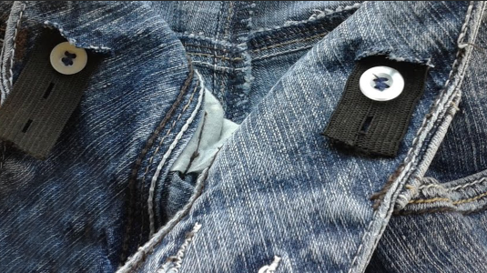 Jeans mit hoher Sicherheit und Beweglichkeit. Die gesamte Hose durchläuft eine Behandlung, bei der das Wasser nur seitlich abfließt, ohne einzudringen.